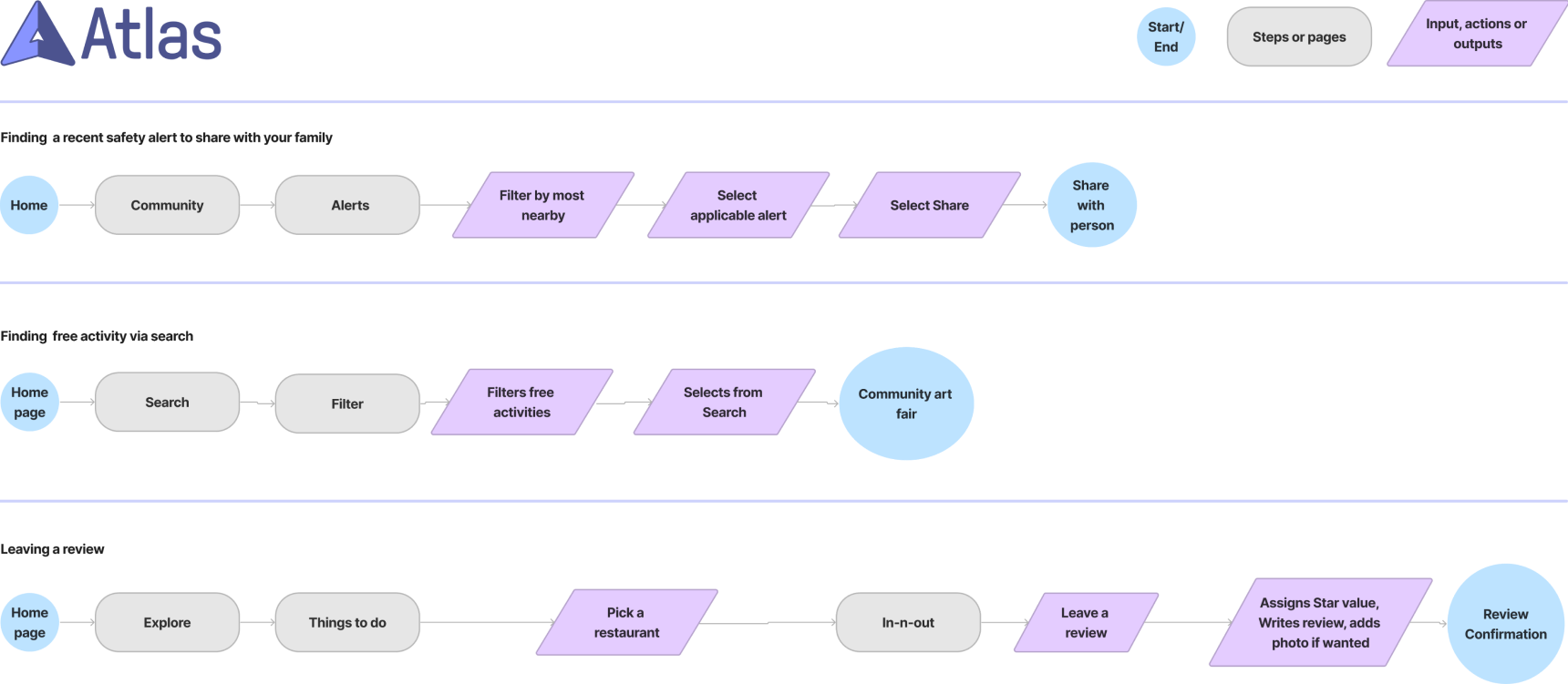 Based on the information architecture, I developed a user-centric sitemap that aligned with the cognitive patterns of my users. Utilizing this sitemap as a foundation, I referred back to the user personas to determine the most crucial task flows for testing.